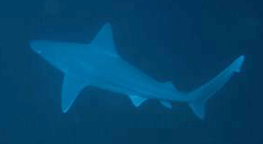 Visite surprise d'un squale que nous ne sommes pas habitués à voir dans la région de Nouméa : deux "requins à haute dorsale" (Carcharhinus plombeus) environ deux mètres de long, l'un deux avec l'extrémité de la nageoire dorsale coupée. Le premier semble affectionner Gene, qui est subitement bien entouré, puis s'en va, laissant la place au suivant. André M. a l'excellent reflexe de faire une série de photos permettant une identification parfaite. La taille moyenne de ce requin est de 1,8 mètres, pouvant aller jusqu'à 3 mètres. Nous observerons un troisième specimen à l'occasion de la dernière plongée au Nord du Récif, côté Ouest (intérieur).